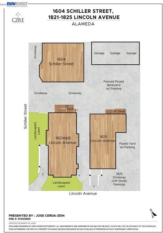 3 Homes on 1 Lot. 4 Units. Rare Alameda Opportunity. Located on the corner of Schiller & Lincoln, this unique compound-style property offers a flexible layout with 2 detached single-family homes and a duplex totaling 4 residential units. Opportunities like this rarely come to market in Alameda. The configuration creates multiple ownership paths for buyers exploring compound living, rental income, or long-term investment potential. Unit mix includes: 1604 – 2 bed / 1 bath; 1821A – 1 bed / 1.5 ba; 1821B – 2 bed / 1 ba; 1825 – 2 bed / 1 ba. The detached homes provide natural separation and flexibility, offering the possibility to live in one residence while generating income from the others or hold as a strategic long-term asset. A detached garage structure and the configuration of 3 homes on 1 lot may present additional possibilities for creative use, potential ADU, or future parcelization concepts. Ideally positioned near Grand Street with convenient access to Park Street, Webster Street, South Shore Center, neighborhood parks, dining, the SF Ferry, BART connections, AC Transit, and major commuter routes.
