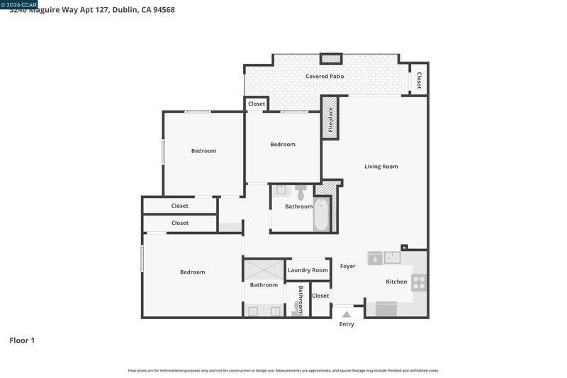 Rarely available ground-floor residence offering true single-level living with no stairs to climb—a highly sought-after and hard-to-find feature in Dublin’s desirable Terraces community. Built in 2002 and meticulously maintained, this home feels like new, blending modern comfort with timeless functionality. This spacious 3-bedroom, 2-bath floor plan is thoughtfully designed for both everyday living and entertaining. The interior showcases low-maintenance marble flooring, recent interior paint, and an updated kitchen with modern finishes, creating a clean, move-in ready environment. The open-concept living and dining areas are filled with natural light and flow seamlessly to the outdoor space. Enjoy effortless indoor-outdoor living with a private patio that opens directly to the community greenbelt, offering a peaceful and inviting setting for relaxing or entertaining. The ground-floor location enhances accessibility while maximizing connection to the beautifully landscaped common areas. Ideally situated across from community amenities and just moments from shopping, dining, parks, and major commuter routes including BART and I-580/I-680, this home offers exceptional convenience in a prime Dublin location. Residents of the Terraces enjoy access to resort-style amenities, including a pool, spa, fitness center, clubhouse, and gathering spaces—all complemented by a low HOA, making this an outstanding value. Additional highlights include in-unit washer and dryer, ample storage throughout, and two secured underground covered parking spaces for added convenience and peace of mind. Whether you’re a first-time buyer, downsizer, or investor, this home presents a rare opportunity to own a turnkey, ground-level residence in one of Dublin’s most connected and desirable communities. A true blend of lifestyle, location, and livability.